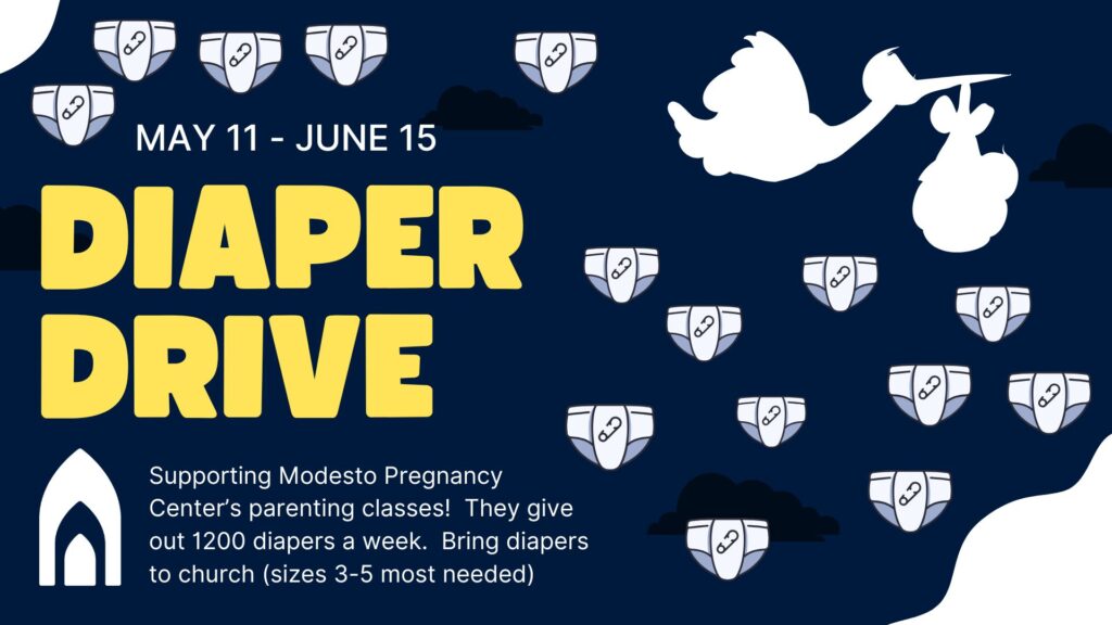 “We give diapers to all of our students who attend our parenting classes, where they learn valuable parenting tools, memorize scripture, and build community. We have roughly 60 parents who attend in person each week, and another 50+ who attend online, so we get to bless a lot of babies with diapers! We almost always have a need for size 4, size 5 and size 6 diapers.”  MPC gives out over 1200 diapers each week!  I really appreciate how MPC is supporting moms and their babies spiritually, relationally, and materially. Let’s bless this new moms and their children with some diapers.  We’ll hold this drive May 11 (Mother’s Day) through June 15 (Father’s Day) bring a pack of size 3, 4, or 5 diapers to church and we’ll get them to MPC.
