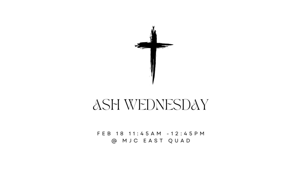 We begin the season of Lent remembering that “we are dust and to dust we shall return.” and we are going to continue our tradition of the imposition of ashes in a public setting at the MJC East campus (in front of the Student Center). We’ll be there from 11:45AM-12:45PM.
