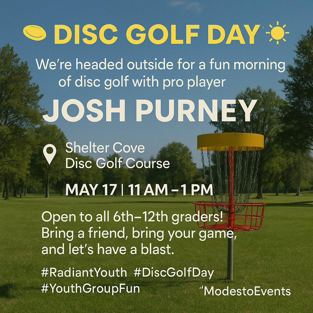 Disc Golf Day is locked in for May 17 from 11 AM to 1 PM at the Shelter Cove disc golf course with our very own professional disc golfer Josh Purney! It’s open to all 6th–12th graders. Excited for a fun time outside!  Sign up here to receive more information on our Radiant Youth gatherings.